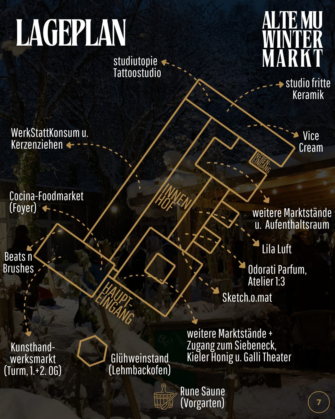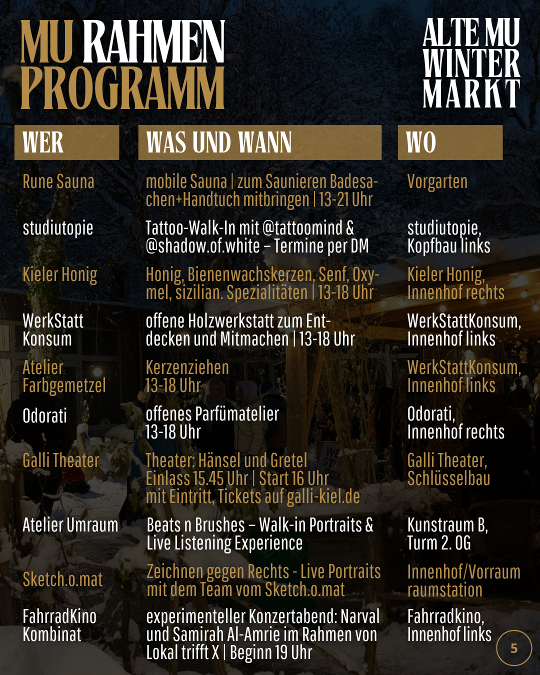 Zwischen den Ständen gibt es viel zu entdecken: Werkeln in der Holzwerkstatt, Honigpralinen zum Selbermachen, Portraitzeichnungen, offene Türen – und um 16 Uhr zeigt das Galli-Theater „Hänsel und Gretel“ für kleine und große Besucher*innen. Im Vorgarten wärmen heißer Apfelpunsch, Glühwein und bei den Gastros warten winterliche Leckereien, verschlungen zu werden.