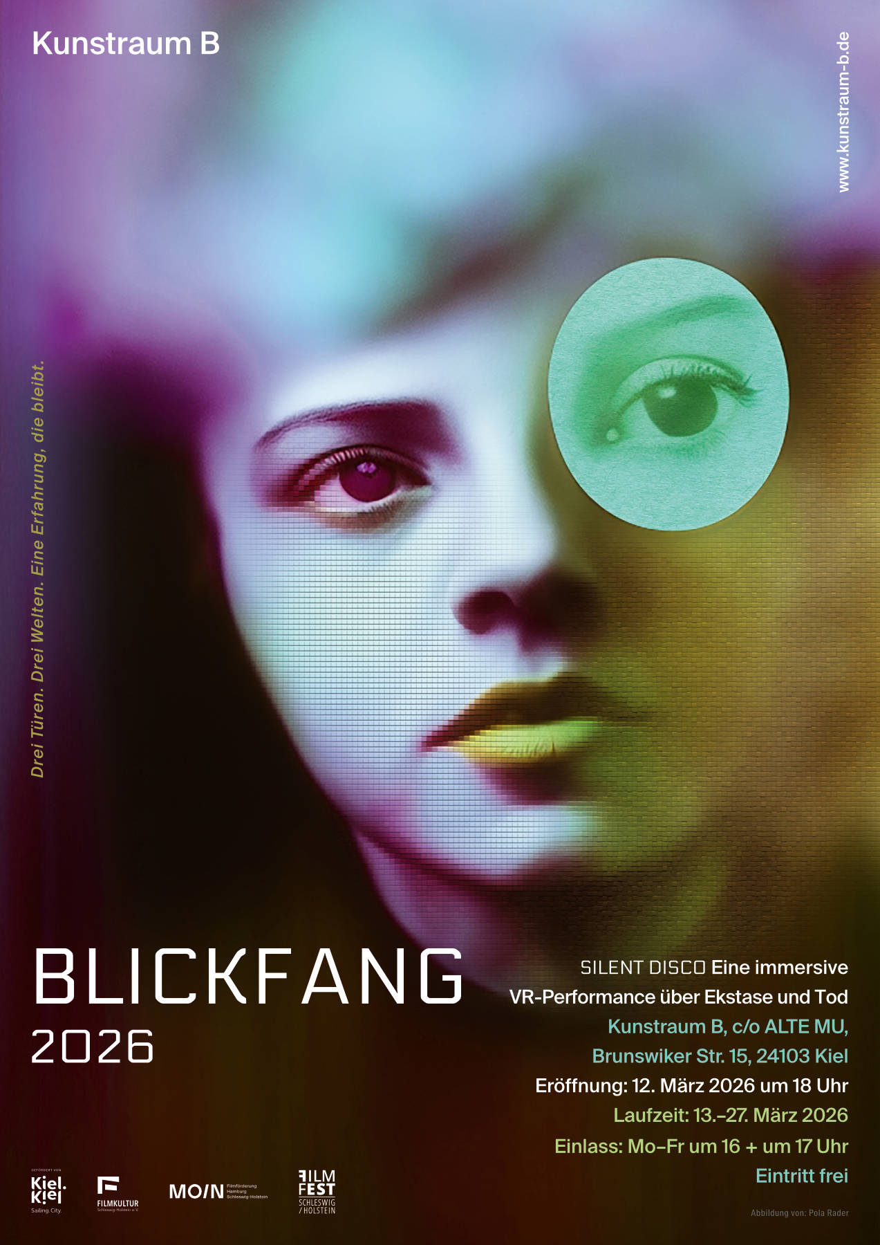 Kunstraum B zeigt in Kooperation mit dem Filmfest Schleswig-Holstein eine Arbeit, die ihresgleichen sucht: SILENT DISCO – eine raumgreifende VR-Installation der Künstler Fabio Thieme (Writer, Director, Producer) und Johannes Schmülling (Director of Photography, Colorist, Co-Producer), kuratiert von Eugenia Bakurin und Dennis Reinmüller. Drei Türen, drei Welten: der Abstieg in eine Höllendisko mit Geisterfahrern im Aufzug, der Blick hinter die Spiegel einer Stripclub-Bühne, ein folkloristischer Totentanz. Mehrere Besucher*innen erleben die Arbeit gleichzeitig in einem clubähnlichen Setting – jede*r für sich in der VR-Brille, und doch gemeinsam im Raum. Die eigenen Bewegungen werden Teil einer Choreografie aus Licht, Klang und digitaler Bildwelt, die Grenzen zwischen Zuschauen und Performen verschwimmen. SILENT DISCO ist eine Reise in die kollektive Isolation unserer Gegenwart, ein Rausch, der unter die Haut geht – und den man so schnell nicht vergisst.