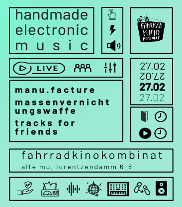Massenvernichtungswaffe ist ein elektronischer Liveact, der mit konstant 130 BPM jede Anlage an die Belastungsgrenze fĂ€hrt. Dawless, direkt und zielsicher mĂ€andert das Duo zwischen Techno und Elektro. Laut, roh, warm, genreblind â keine RĂŒcksicht, maximale Beschleunigung und Filter immer in Bewegung. Kommt mit der modernen Ăsthetik von VHS-Wiedergabesystemen und einer entspannten U-Bahn-Fahrt durch Kiel endlich wieder zurĂŒck ins FKK.